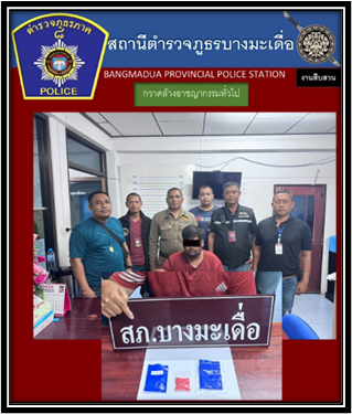 – ข้อหา จำหน่ายยาเสพติดให้โทษประเภท 1 (เมทแอมเฟตามีน)ฯ จำนวน 2 ราย ผู้ต้องหา 2 คน พร้อมของกลาง ยาบ้า จำนวน 28 เม็ด จากการสืบสวนทราบว่า ผู้ต้องหาได้มามั่วสุมกันในที่เกิดเหตุ จึงได้เหตุทางไปตรวจสอบ พบผู้ต้องหา พร้อมด้วยของกลาง