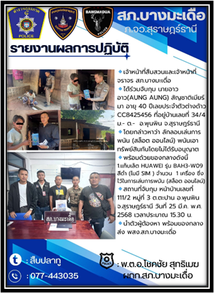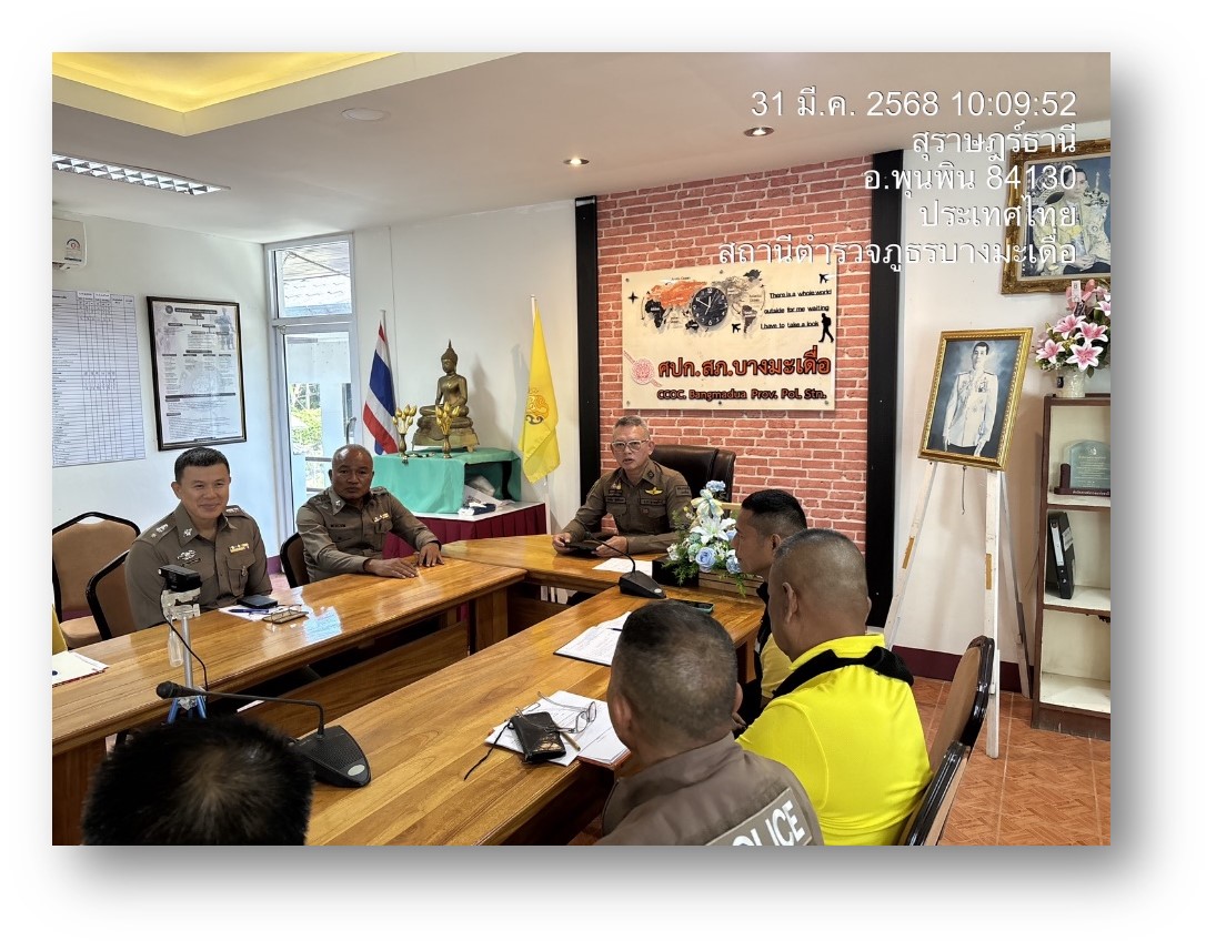 เมื่อวันที่ ๒๘ มีนาคม ๒๕๖๘ เวลา ๑๔.๐๐ น. ณ ห้อง ศปก.สภ.บางมะเดื่อ พ.ต.อ.โชคชัย สุทธิเมฆ ผกก.สภ.บางมะ